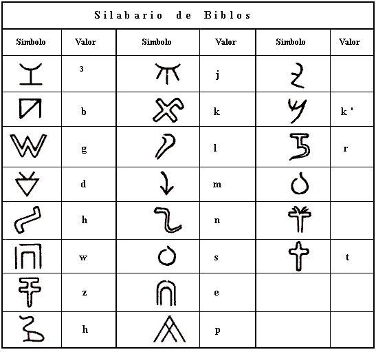 Debajo tenemos el alfabeto silábico de Biblos. En la columna 1 tenemos los signos y en la 2 los valores consonánticos de base.