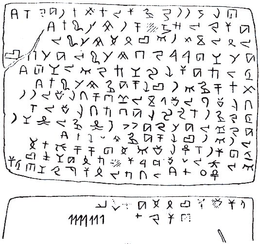 La tablilla de bronce inferior es del 1790 antes de Cristo aproximadamente. La parte superior es el anverso y la inferior el reverso. Esta tablilla fue la que dio la clave a Dhorme para el desciframiento de esta escritura. Dhorme se fijó en los siete símbolos que aparecen al final del reverso y que recuerdan nuestro número 1: se trataba del indicativo de una fecha. La traducción de esta tablilla es la siguiente: