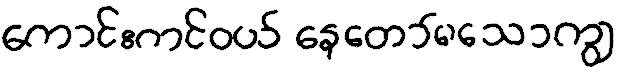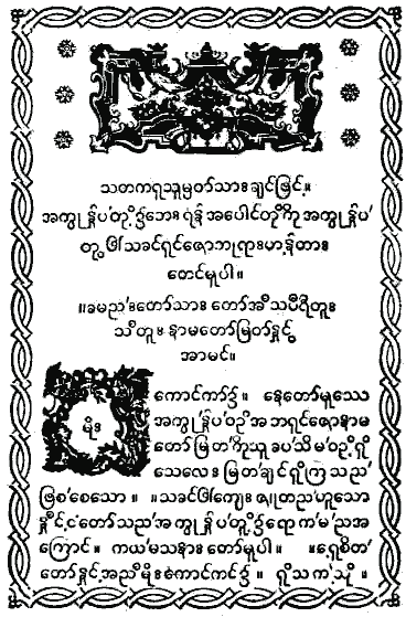 La figura inferior muestra el texto anterior en caracteres birmanos y en la misma lengua, karen, pero en dialecto sgaw, hablado en la baja Birmania.