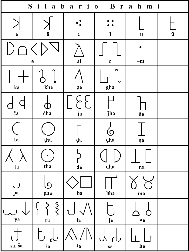 A primera vista (figura inferior) se pueden distinguir los orígenes semitas del sistema brahmi; por ejemplo las letras dha, tha, la y ra se parecen bastante a sus antecesoras semitas. No obstante hay quien piensa que el brahmi no procede del semita occidental sino de un alfabeto del valle del Indo.