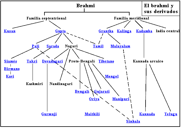 La tabla inferior muestra la relación entre los algunos de los sistemas de escritura de la India y de regiones más allá.