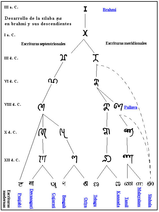 Casi todas las escrituras indias contemporáneas, a excepción de las importadas por el Islam, están, de una u otra manera, modeladas sobre el brahmi, aun las del sur que sirven a lenguas pertenecientes a una familia completamente distinta, como es la dravídica. En la figura inferior puede apreciarse un ejemplo de lo que decimos. En ella se ve el desarrollo de la sílaba na en brahmi y en sus descendientes actuales, pasando por las etapas intermedias.