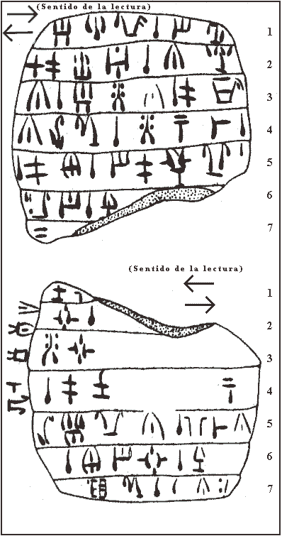 La figura inferior muestra tres cortos textos procedentes de Enkomi, que como otras inscripciones chipro-minoicas, se caracterizan por su extrema brevedad.