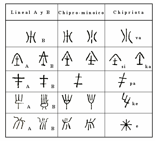 El chipro-minoico va a evolucionar hacia el silabario chipriota tal como queda atestiguado por la figura inferior en la que se aprecia su relación con los lineales creteneses A y B, por un lado, y con el chipriota por otro.