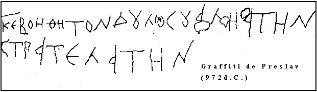 La figura inferior muestra un graffiti escrito por Aliates Stratelat, comandante de la guarnición de Bizancio, en la iglesia de Preslav.
