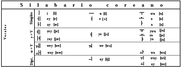 Promulgado en 1446 d. C. como "escritura popular", el sistema hangul (figura superior) es mixto (alfabético y silábico) y es usado en Corea del Norte. Originalmente el sentido de la escritura era de arriba hacia abajo comenzando por la derecha, actualmente es horizontal de izquierda a derecha.