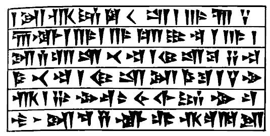 La lengua elamita no es semítica y no está relacionada con otras lenguas del Medio Oriente. Su desciframiento fue posible gracias a los textos trilingües (figura superior) de los reyes persas (el texto en elamita está abajo del todo, arriba en persa antiguo y en el centro en babilonio), pero como los temas de estas inscripciones son muy reducidos, nuestro conocimiento de la lengua es muy limitado todavía. Uno de esos textos, representado en la figura inferior, dice lo siguiente: