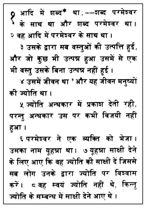 La figura inferior muestra un texto de la Biblia, Juan 3:16, en caracteres devanagari y dialecto bhojpuri de la lengua bihari.