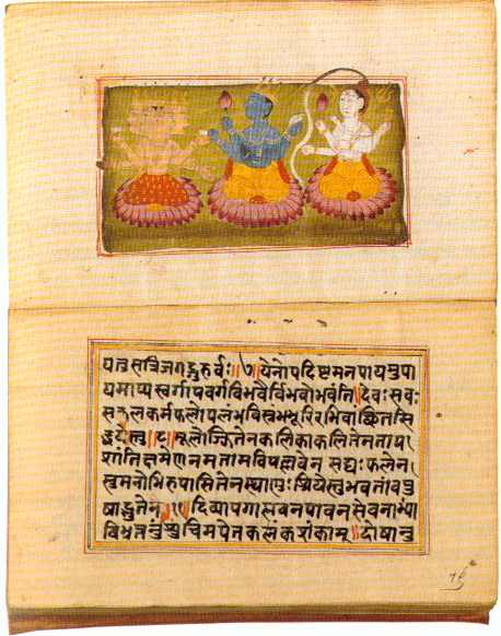 La ilustración inferior muestra un texto en devanagari. Los tres personajes sobre flores de loto son las tres divinidades hindúes: Siva, Visnú y Brahma.