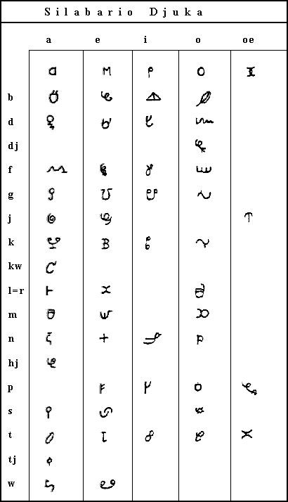 La presencia de estos últimos símbolos en la escritura es asunto de interés dada la separación geográfica y temporal (más de 150 años) de los negroes bush de África occidental. El silabario consiste de 58 signos, de los cuales 5 tienen valor vocálico (a, e, i, o y u) y los restantes son signos consonante + vocal. |