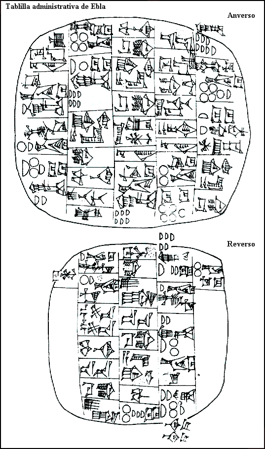 Mucho de lo escrito en esas tablillas está en lengua sumeria y por lo tanto ello no nos da la clave para conocer la lengua local. Los escribas de Ebla tomaron de Sumer el uso del barro como medio de escritura y el cuneiforme sumerio como su sistema, y por conveniencia siguieron usando la mayor parte de los signos sumerios para la mayoría de los objetos y transacciones que sus textos comerciales registran. Se estima que el 80 por ciento de las palabras en los textos de Ebla son sumerias y el 20 por ciento restante reflejan la lengua local, llamada ahora lengua eblaíta. La figura inferior procede de los archivos reales de Ebla y es de mediados del III milenio antes de Cristo.