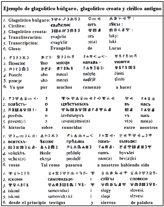 La figura inferior muestra un ejemplo de glagolítico búlgaro y cuya traducción dice:
