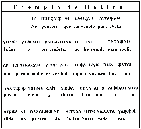 La evangelización de estos pueblos comienza a partir del siglo IV, y con tal propósito Ulfilas crea un alfabeto (figura superior) a fin de registrar la lengua gótica. La traducción de la Biblia de Ulfilas es el testimonio escrito más antiguo de la lengua germánica. Los godos para los cuales estaba escrita vivían en la región inferior de Moesia, a orillas del río Danubio, en el territorio de la actual Bulgaria. La figura inferior muestra una página del Codex Argenteus de la Biblia de Ulfilas.