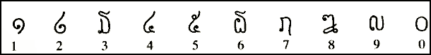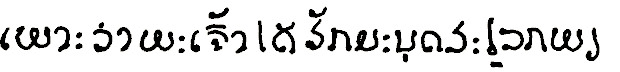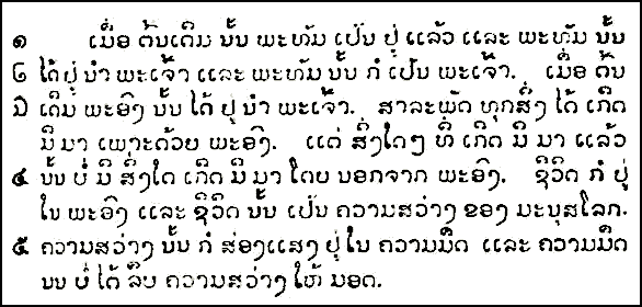 La figura inferior muestra un texto de la Biblia, Juan 3:16, en caracteres lao y en dialecto lao oriental, hablado en el delta del río Mekong.