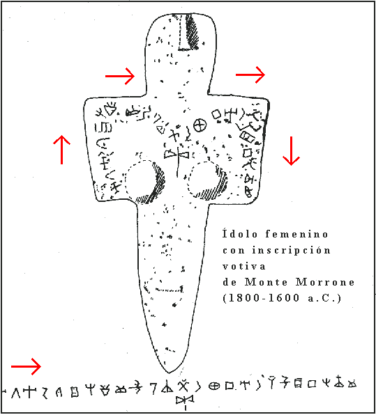 Difusión del Lineal A Entre estas últimas se han encontrado algunos ejemplos en el sur de Fenicia y en Ugarit. Uno de ellos es una inscripción grabada en un ídolo femenino de barro portando la doble hacha entre los pechos. Procede de Monte Morrone, en el lado italiano del Mar Adriático y se calcula que es de 1800 a 1600 a. C.