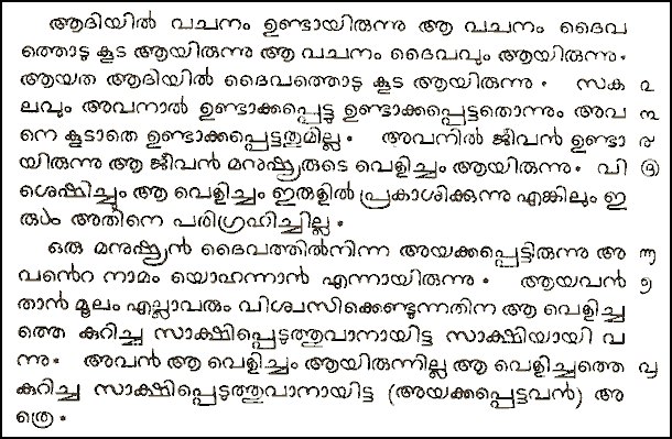 La figura inferior muestra el mismo texto, Juan 3:16, en caracteres malayalam y lengua malayalam, hablada en la costa de Malabar, India.