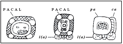 La figura inferior contiene cinco formas de escribir la palabra "balam" (jaguar), con distintas proporciones de fonogramas y logogramas.