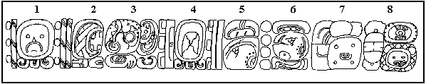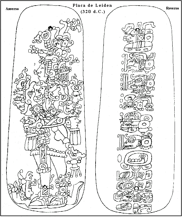 Otra famosa inscripción maya es la placa de Leiden (figura inferior), procedente de Petén y portadora de la fecha 8.14.3.1.12, 1 Eb, G5 o Yaxkin, correspondiente al 16 de septiembre del 320 d. C. según el calendario juliano y conmemora la entronización de un gobernante del linaje de Tikal.