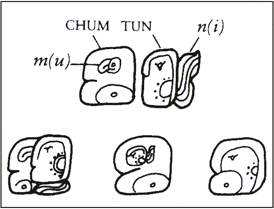 Su escritura era del tipo mixto (como la cuneiforme, los jeroglíficos egipcios y el chino), es decir, usaban pictogramas, ideogramas y fonogramas. Aunque los glifos egipcios son mixtos, los mayas son mucho más complejos, porque la misma palabra puede escribirse de varias formas, no sólo de dos o tres. Además, los glifos individuales estaban con frecuencia "soldados" entres sí, como en la escritura china, pero cosa que nunca sucede en el egipcio; sin embargo, en maya lo están tan íntimamente que sólo un experto consigue separar visualmente las partes de que se compone. La figura inferior muestra un ejemplo de lo que decimos: dos glifos que se leen "chum tun", conjuntados de tres formas distintas, siendo las cuatro formas de la palabra correctas. Las minúsculas son fonogramas, las mayúsculas, logogramas.