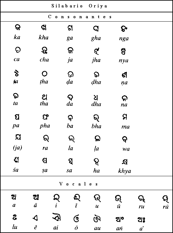 3. En algunas partes de Ganjam (la antigua Utkala) en la costa oriental de la India al sur de Orissa, los caracteres oriya son más redondeados que en los de Orissa mismos, tal vez debido a la influencia del telugu.