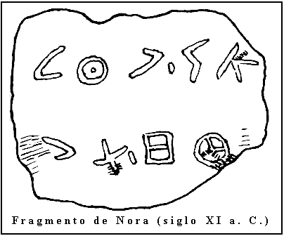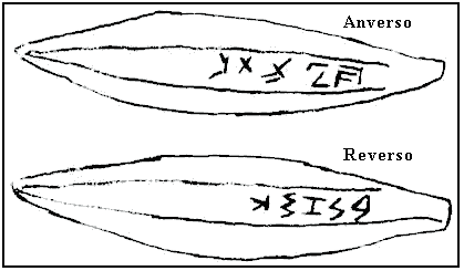 En la figura inferior se aprecia la inscripción en un cono de cerámica de unos 9 cm. de largo, fechada hacia el siglo XIII a. C. La lectura de la inscripción es: