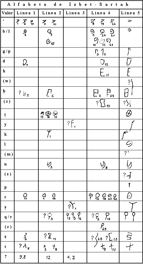 La figura inferior muestra las letras de la inscripción de Izbet Sartah arregladas por líneas y orden de izquierda a derecha. Las cifras hacen referencia al orden de la letra en su línea correspondiente.