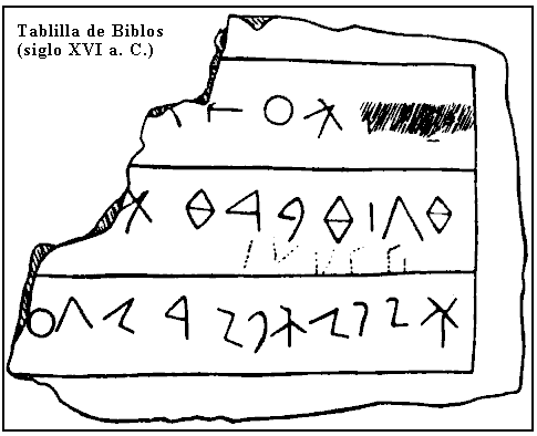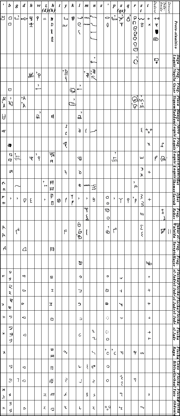 La tabla inferior muestra las distintas inscripciones proto-cananeas y su valor fonético.