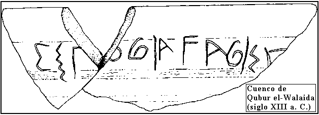 En un fragmento de cuenco inscrito (figura inferior) hallado en Qubur el-Walaida, en el noroeste del Negev, las letras fueron datadas hacia el 1200 antes de Cristo. El texto está escrito de izquierda a derecha con separadores (columnas verticales) de división de palabras. La lectura es la siguiente: Simipal (hijo de) Iyya-El 10 (?) ovejas (o sekhel)