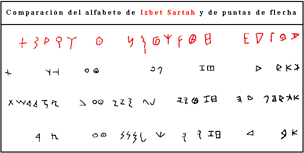 La figura inferior muestra una comparación entre el alfabeto de la inscripción de Izbet Sartah y el de las puntas de flecha.