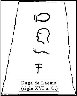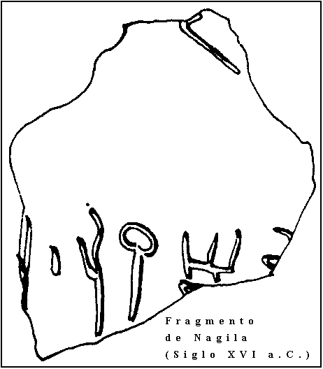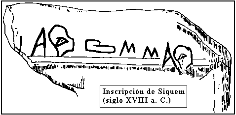 La de la figura inferior es la inscripción hallada en Siquem. Nótese la aleph de la izquierda en su forma lineal, casi idéntica a nuestra A. Al lado vemos la pictografía resh, cabeza, lo que indica que ya para entonces coexisten formas lineales y pictográficas. No obstante, pudiera ser que ese signo fuera otra letra que en esta etapa de su desarrollo se parece a una A. Por ejemplo, puede ser una dalet, forma transicional entre el pescado proto-sinaítico y el triángulo de los siglos XIII-XII a. C.