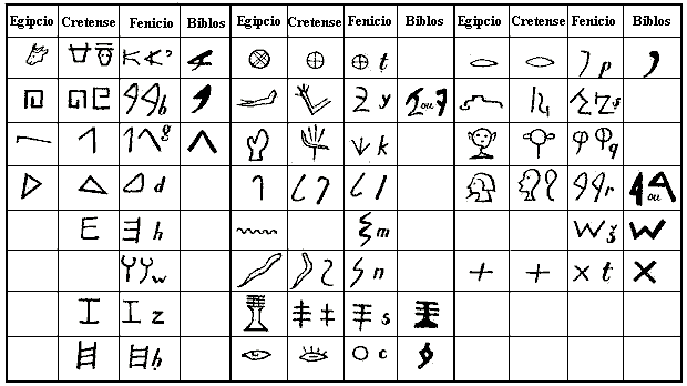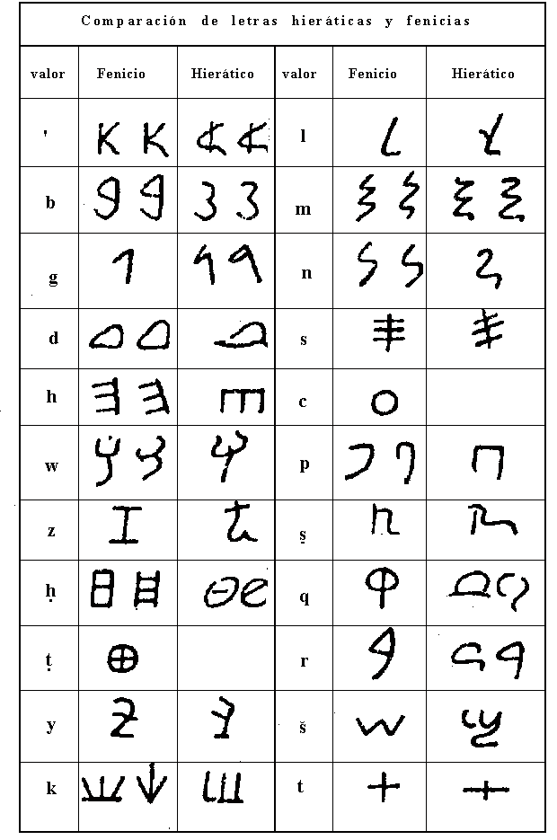 Sobre el origen de este sistema de escritura, que a su vez es el antepasado de tantos otros, se han hecho multitud de teorías. Hay quien apuesta por la paternidad egipcia, en vista de la similitud de las letras hieráticas y fenicias (figura inferior).