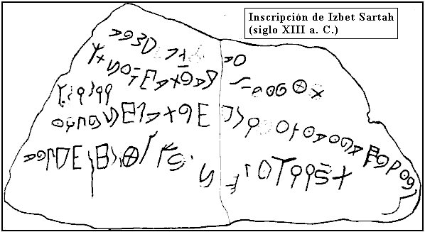 y la inscripción de Izbet Sartah de la misma fecha. Esta última inscripción (figura inferior), contiene más de 80 letras escritas en cinco líneas por una mano no muy diestra. Se trata de un fragmento de una jarra de almacenamiento; las letras fueron grabadas tras la ruptura de la jarra. Tiene 5 líneas de escritura, teniendo la línea inferior las 22 letras del alfabeto, aunque la pe y la ayin están intercambiadas y hay varios errores.