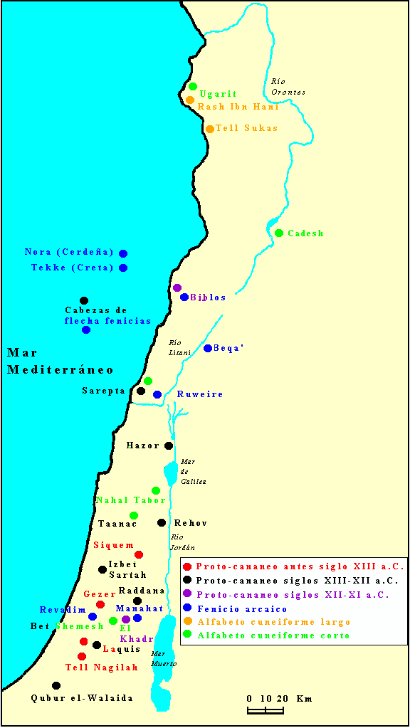 El mapa inferior muestra la ubicación de los distintos hallazgos de inscripciones proto-cananeas y fenicias arcaicas.