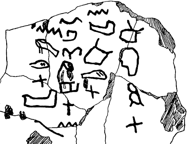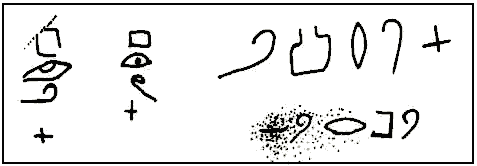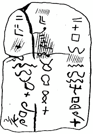 La inscripción superior está hecha sobre roca. Contiene tres columnas de escritura que se leen de derecha a izquierda. Esta es una de las inscripciones proto-sinaíticas más extensas, pero también una de las más frustrantes, pues aunque la piedra no está rota, su superficie ha sido dañada por agentes naturales y humanos. La imagen inferior muestra un fragmento de una placa de piedra de 20 X 25 cm. El texto está compuesto de cuatro columnas de letras fuertemente inscritas. La lectura es la siguiente: Columna 1: 'rht Columna 2: mp'dt(? Columna 3: tltrbtm Columna 4: md'tpn