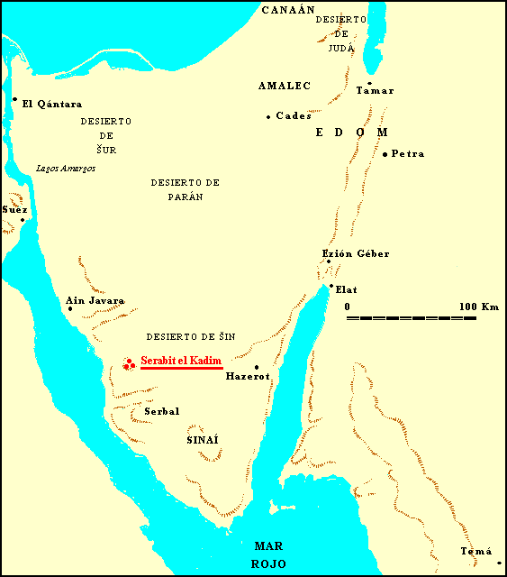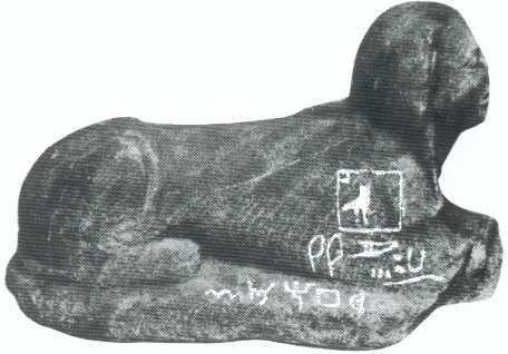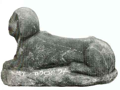 La inscripción vertical dice lo siguiente: 'nt tpn dkm l'bb mn; que traducido es: 'Oh tú, Shafan, recoge de 'Ababa ocho minas de turquesa.' La horizontal dice: sm' mr' rb 'prm; que significa: 'Shimea, palafrenero del jefe de los caravaneros(?).' La esfinge y su mensaje Uno de los objetos más interesantes hallados en Serabit el-Khadim era una esfinge que portaba textos escritos en jeroglífico egipcio y en escritura sinaítica.