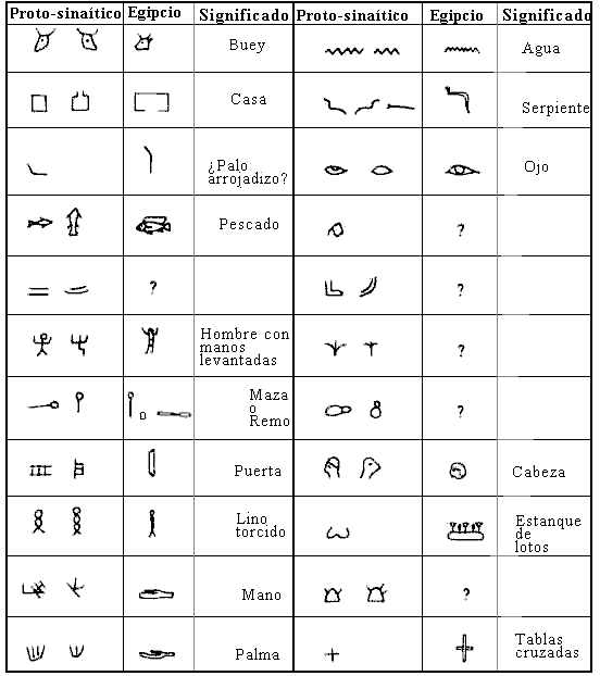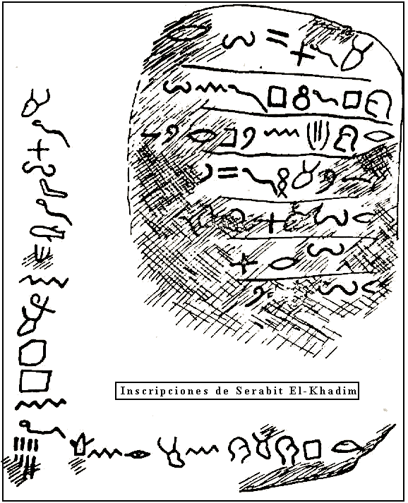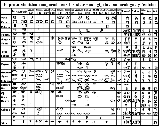 La figura inferior muestra la evolución, a partir del jeroglífico egipcio, de los signos proto-sinaíticos hacia los sistemas sudarábigos, fenicios y judaico.