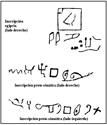 La figura inferior muestra un diagrama en el que se comparan diversos sistemas de escritura semíticos a partir del proto-sinaítico.