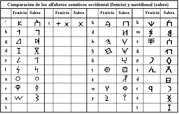 La tabla inferior muestra una comparación entre los distintos alfabetos semíticos meridionales.