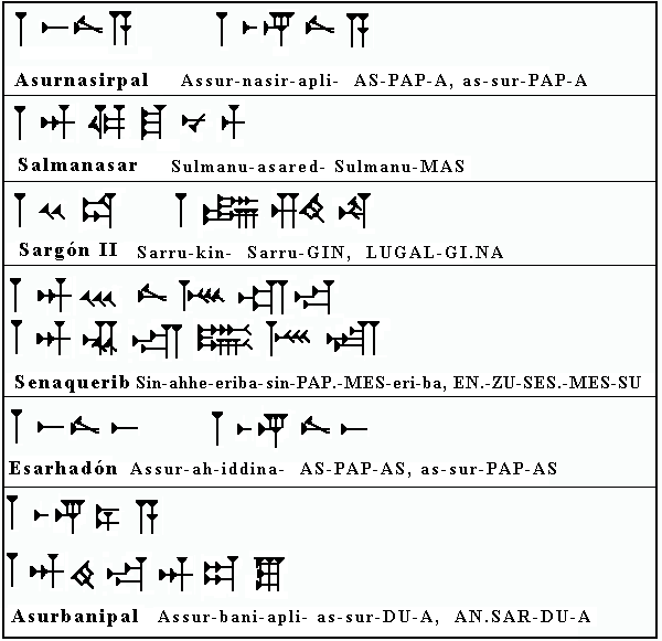 La escritura de los nombres de algunos de los reyes asirios se aprecia en la figura inferior.
