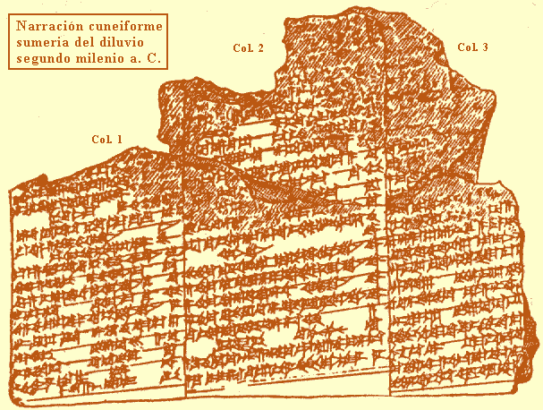 La narración sumeria de Ziusudra (figura inferior), pertenece a la primera mitad del segundo milenio a. C. y se conserva fragmentaria en una tablilla de arcilla de Nippur (Mesopotamia septentrional). Trata del diluvio como parte de una epopeya sumeria que se inicia con la creación, y describe los fundamentos celestes de los reinos terrestres. Los pasajes relacionados con el diluvio dicen: