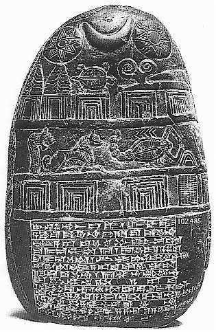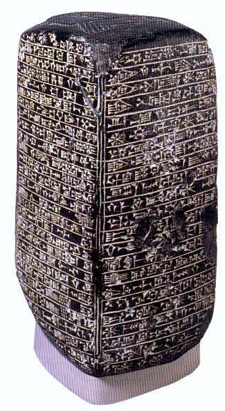 La figura lateral muestra una roca basáltica en la que está labrada la descripción de la restauración de Babilonia, hacia el 670 a. C., realizada por el rey asirio Asarhaddón (681-669 a. C.)