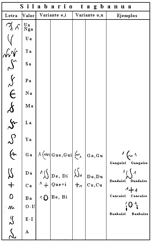 La ilustración inferior muestra el silabario tagbanua; como puede observarse la variación del signo silábico ocurre al poner a la derecha o la izquierda de la letra una marca.