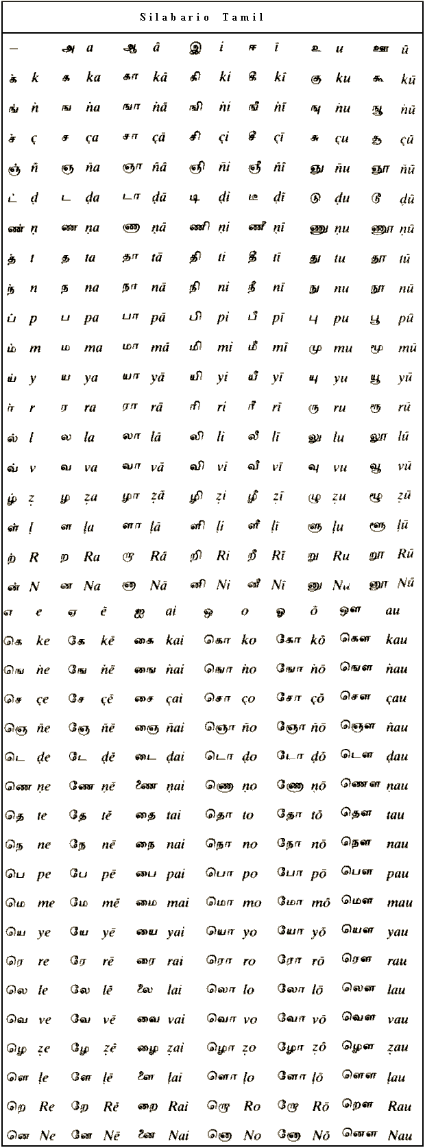 El silabario tamil procede del brahmi a través del grantha. El sistema consiste de 18 consonantes ("letras del cuerpo") más 12 vocales ("letras del alma"), incluyendo dos diptongos. Hay cinco letras grantha que se usan para palabras sánscritas, y hay un signo para el visarga, los dos puntos.
