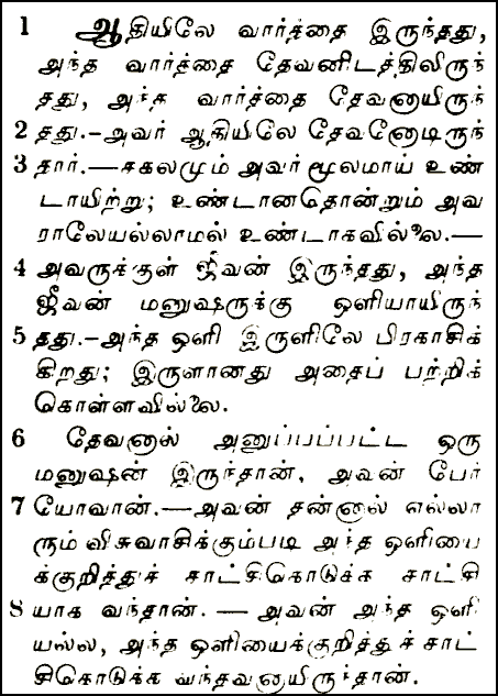La figura inferior muestra un texto de la Biblia, Juan 3:16 en caracteres tamil y lengua toda, hablada en las cumbres Nilgiri, al sur de la India.