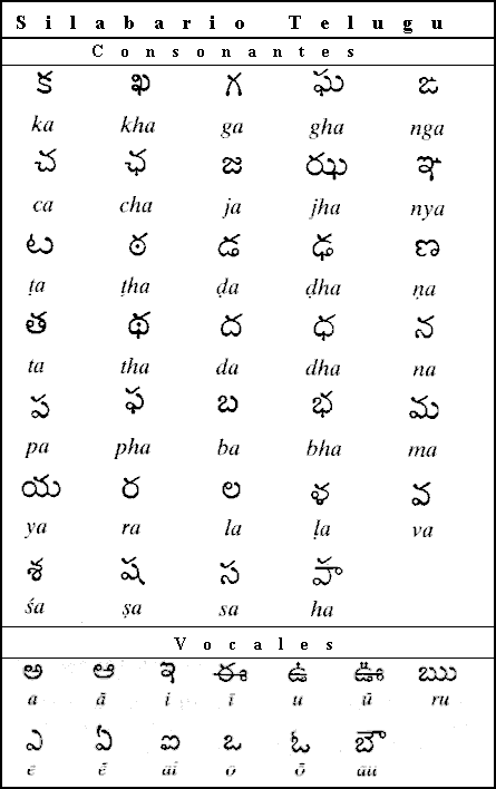 La escritura telugu tiene 34 letras que respetan el orden de la devanagari.