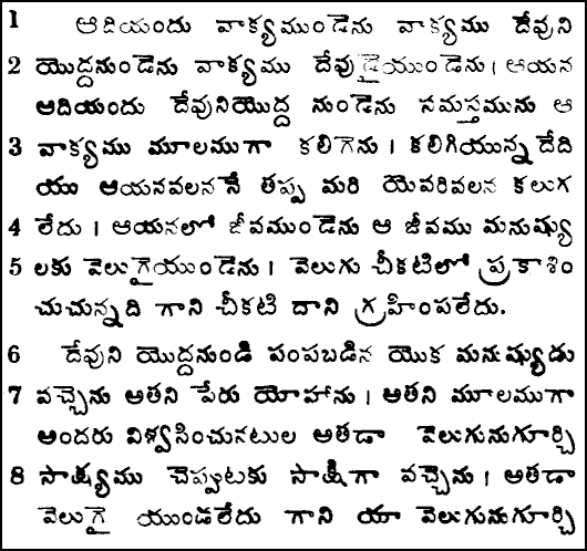 La figura inferior muestra un texto de la Biblia, Juan 3:16, en caracteres telugu y lengua telugu.