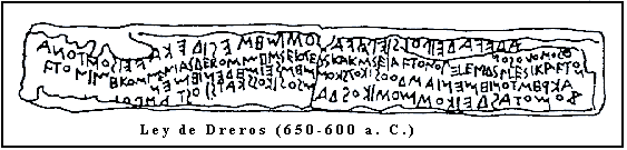 En el templo de Apolo Delfinio en Dreros (Creta) se han encontrado 8 inscripciones griegas arcaicas. Una es la denominada Ley de Dreros, que constituye el ejemplo más antiguo de ley griega inscrita sobre piedra que se ha conservado intacta hasta nuestros días. La inscripción consiste de cuatro líneas, las tres primeras están en bustrófedon y la cuarta de derecha a izquierda. La lectura es como sigue: '¡Sea el dios propicio! pareció bien a la ciudad lo siguiente: una vez que haya ejercido la magistratura que el mismo no la ejerza por espacio de diez años. Y si ejerciera la magistratura en todos los casos en los que dictara sentencia, él mismo pagará una multa doble y será privado de por vida de sus derechos cívicos y lo que haya realizado como magistrado será nulo. Los que prestan juramento: el magistrado, los damioi y los veinte de la ciudad.'