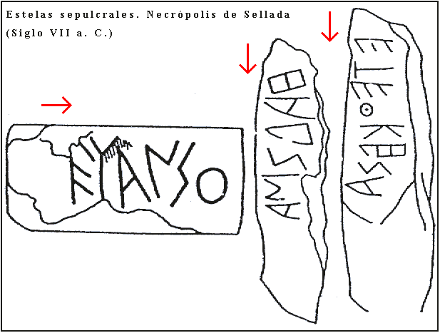 La figura inferior muestra tres estelas sepulcrales de la necrópolis de Sellada en la isla de Tera y sus lecturas son las siguientes: