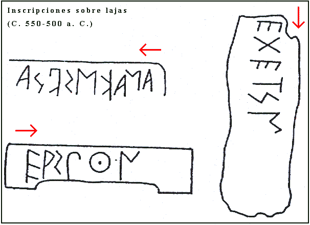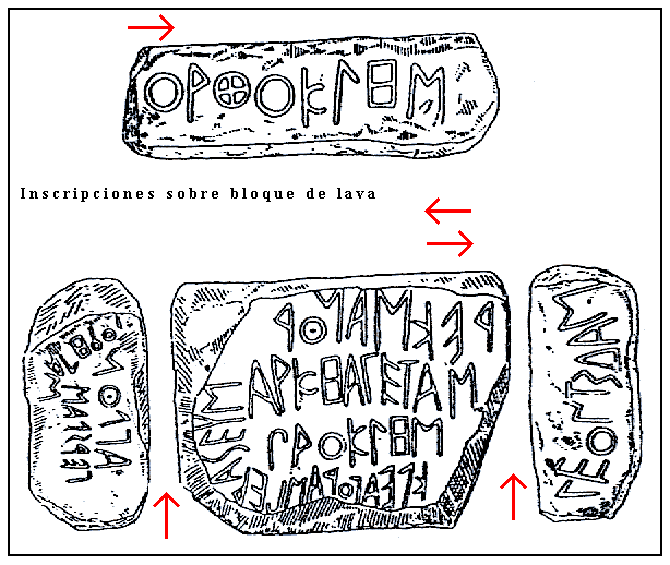 La figura inferior muestra otras inscripciones de Tera sobre bloques de lava. Sus lecturas son las siguientes: