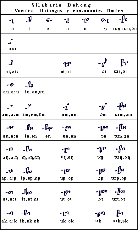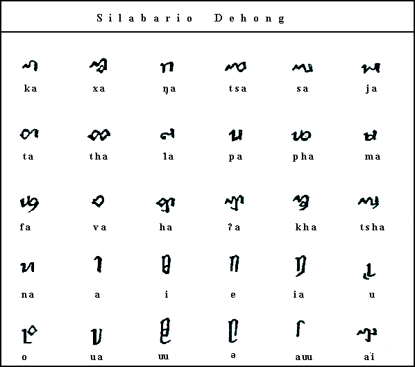 La escritura dehong se usó para escribir la lengua jingpo en la provincia de Yunnan en China. El nombre de la escritura y del pueblo procede del chino, siendo el autónimo laiati 'escritura tai'. La indicación vocal sigue el típico sistema de las escrituras índicas, al incluir en la consonante la vocal a, siendo expresada cualquier otra vocal por diacríticos añadidos al efecto.